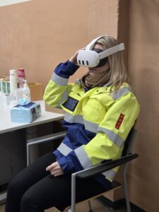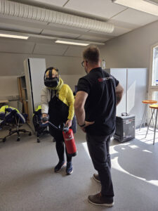 Turvallisuuspäivänä pääsi kokeilemaan VR-lasien ja oikean painoisen sammuttimen kanssa virtuaalista sammutusta.